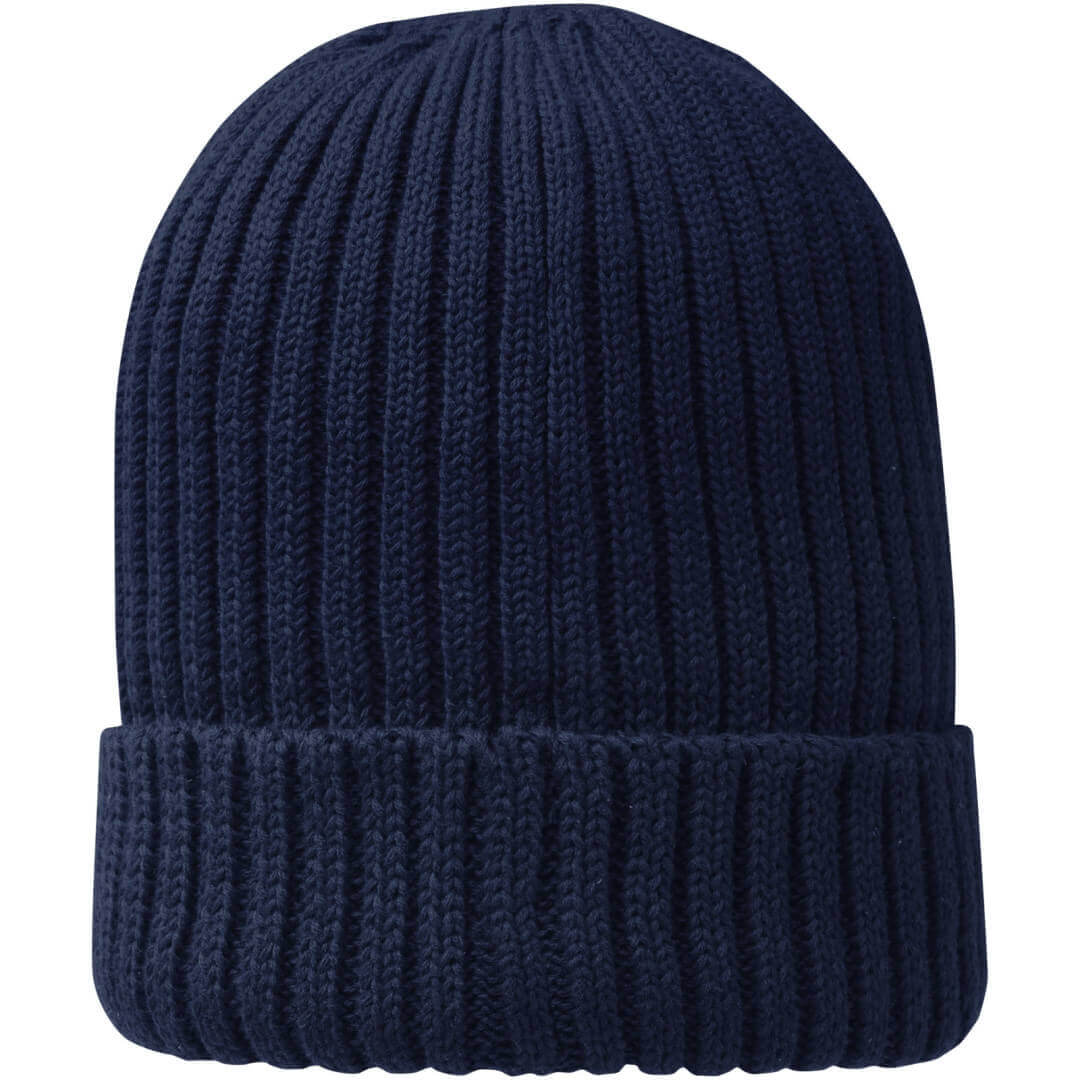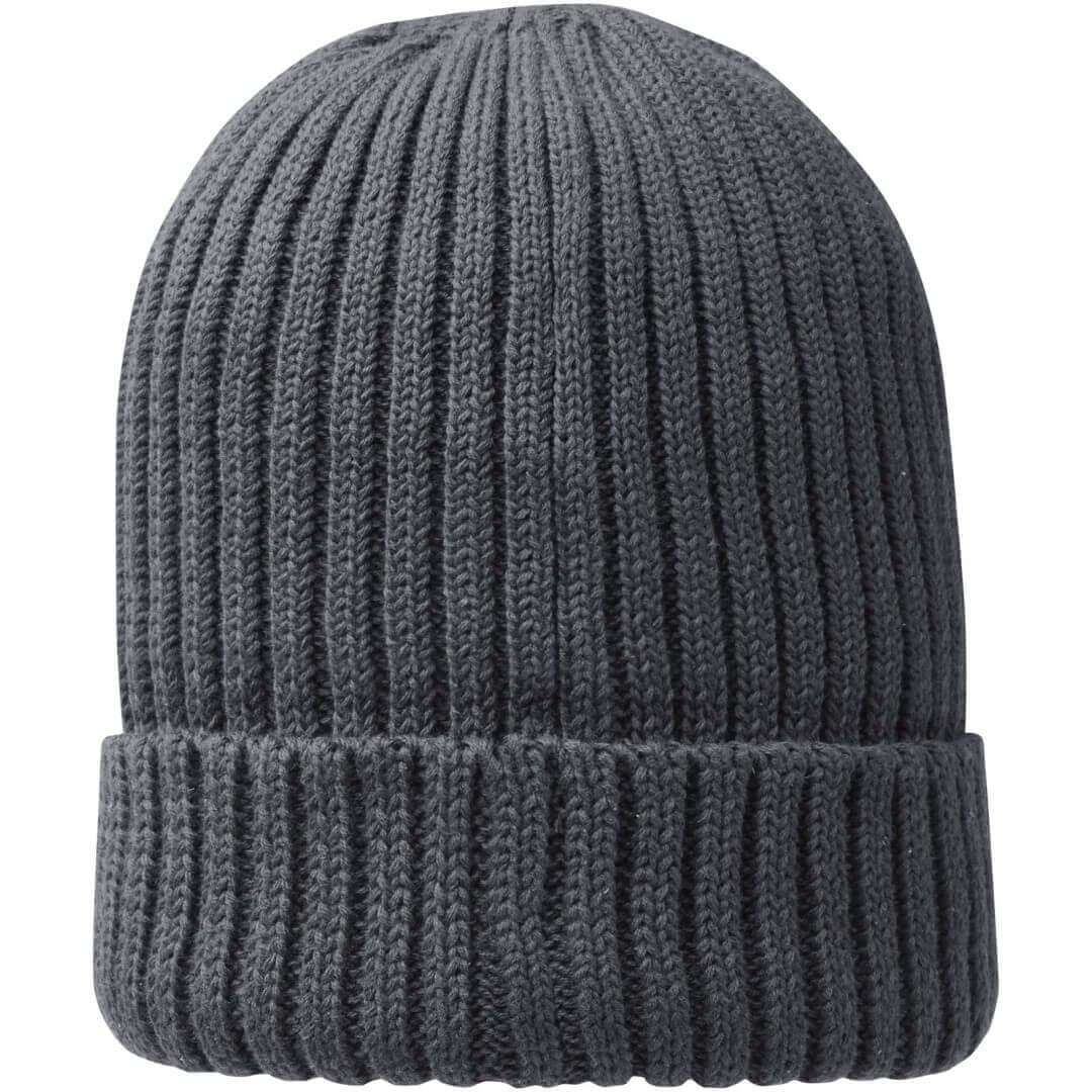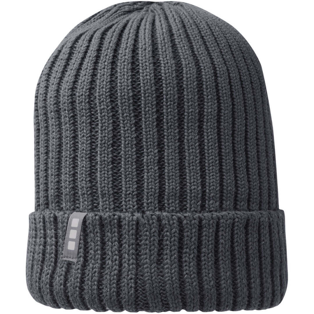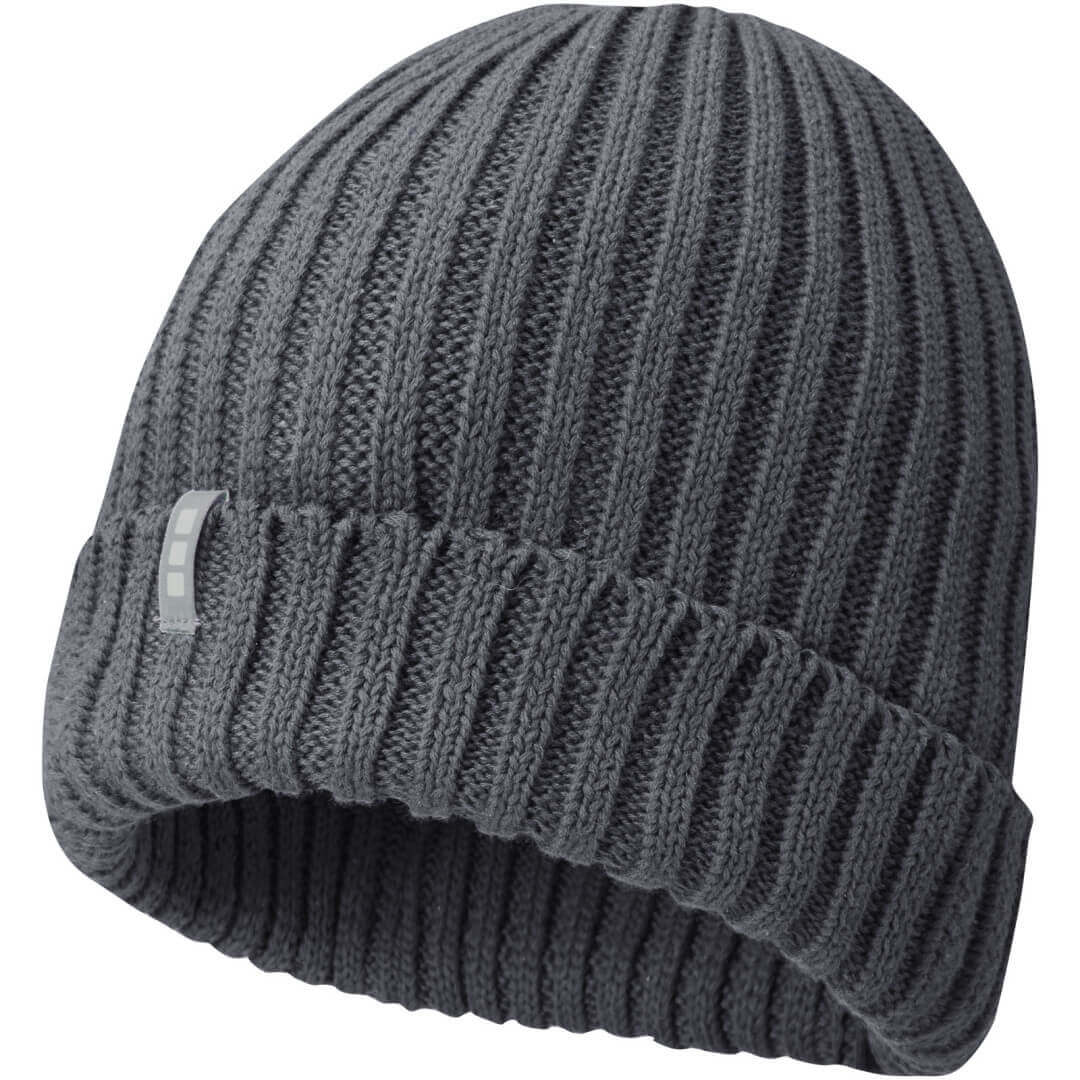Reklamní čepice z udržitelných materiálů. Jednovrstvá beanie čepice s dvakrát přeloženým okrajem. Poutko se značkou.