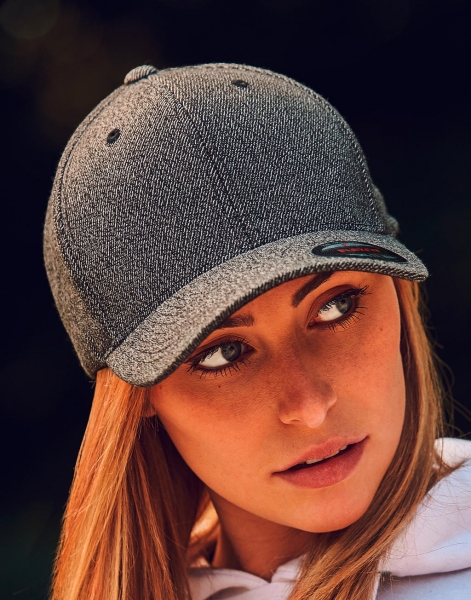 98% polyester, 2% elastan, sportovní střih, speciální Melange tkaná textilie, hrubé plátno, 6 panelů, kšilt s 8 řadami stehů, podhled v kontrastní barvě (Grey), předzakřivený kšilt, integrovaný elastický pas.