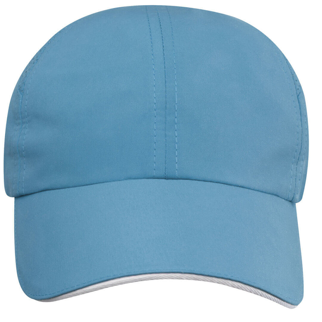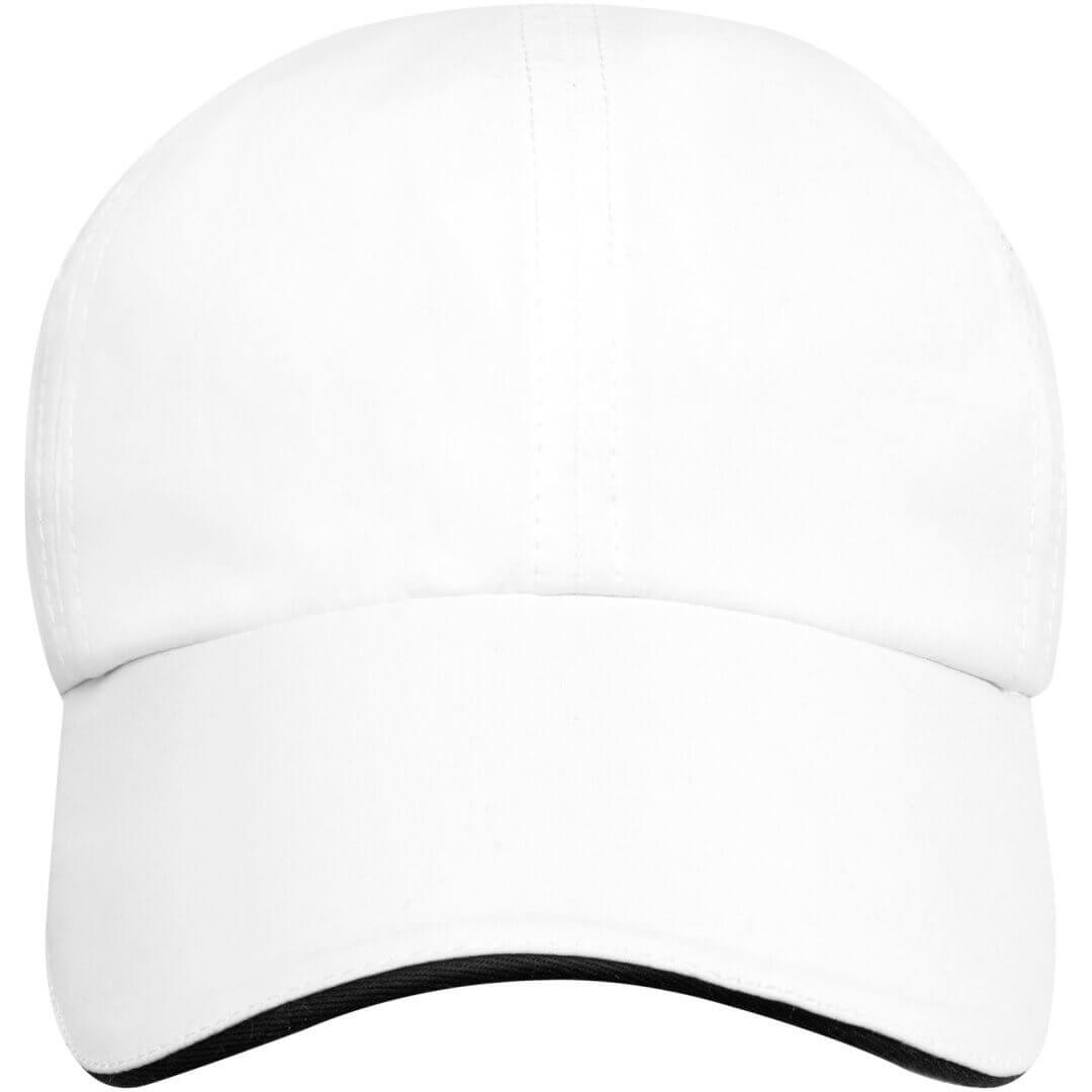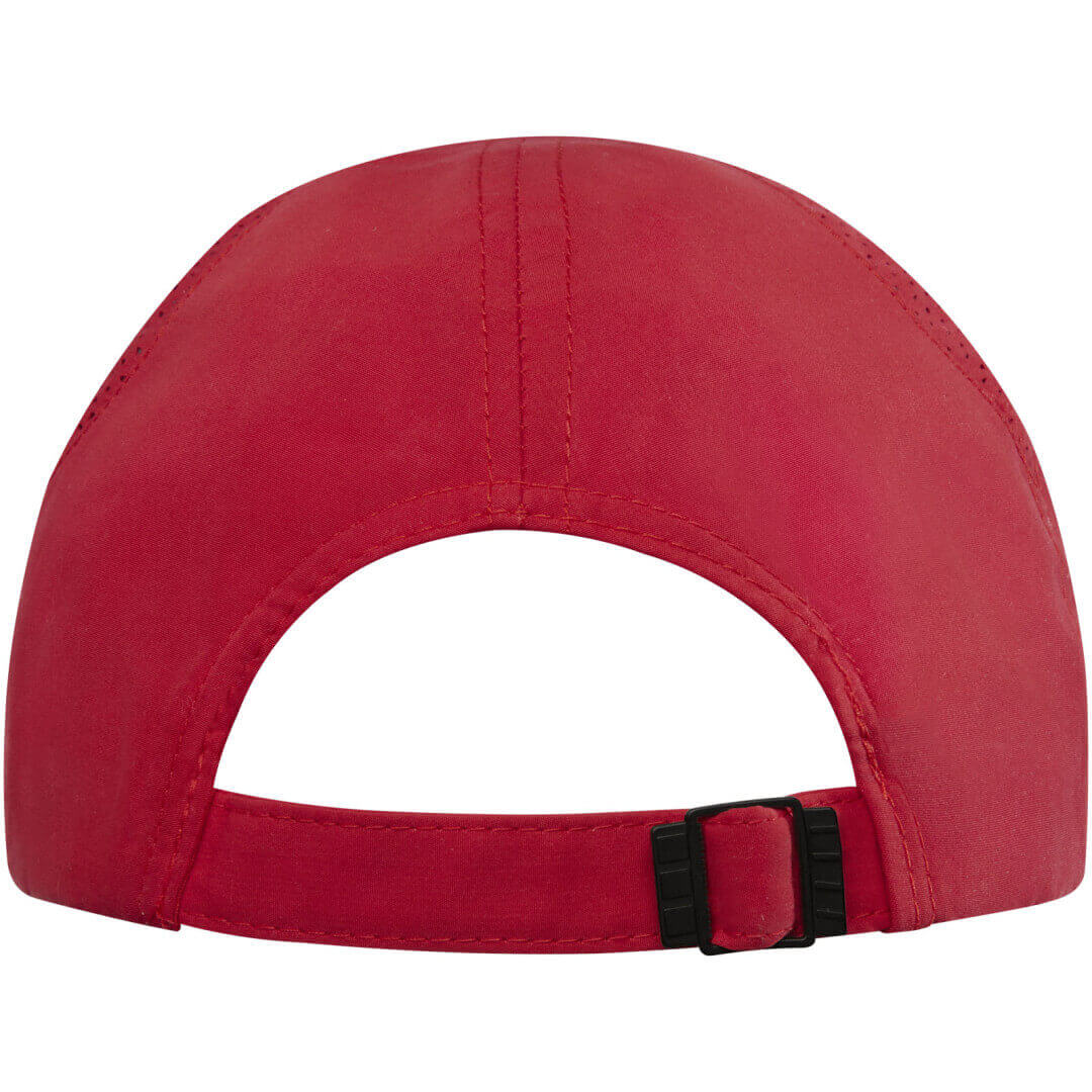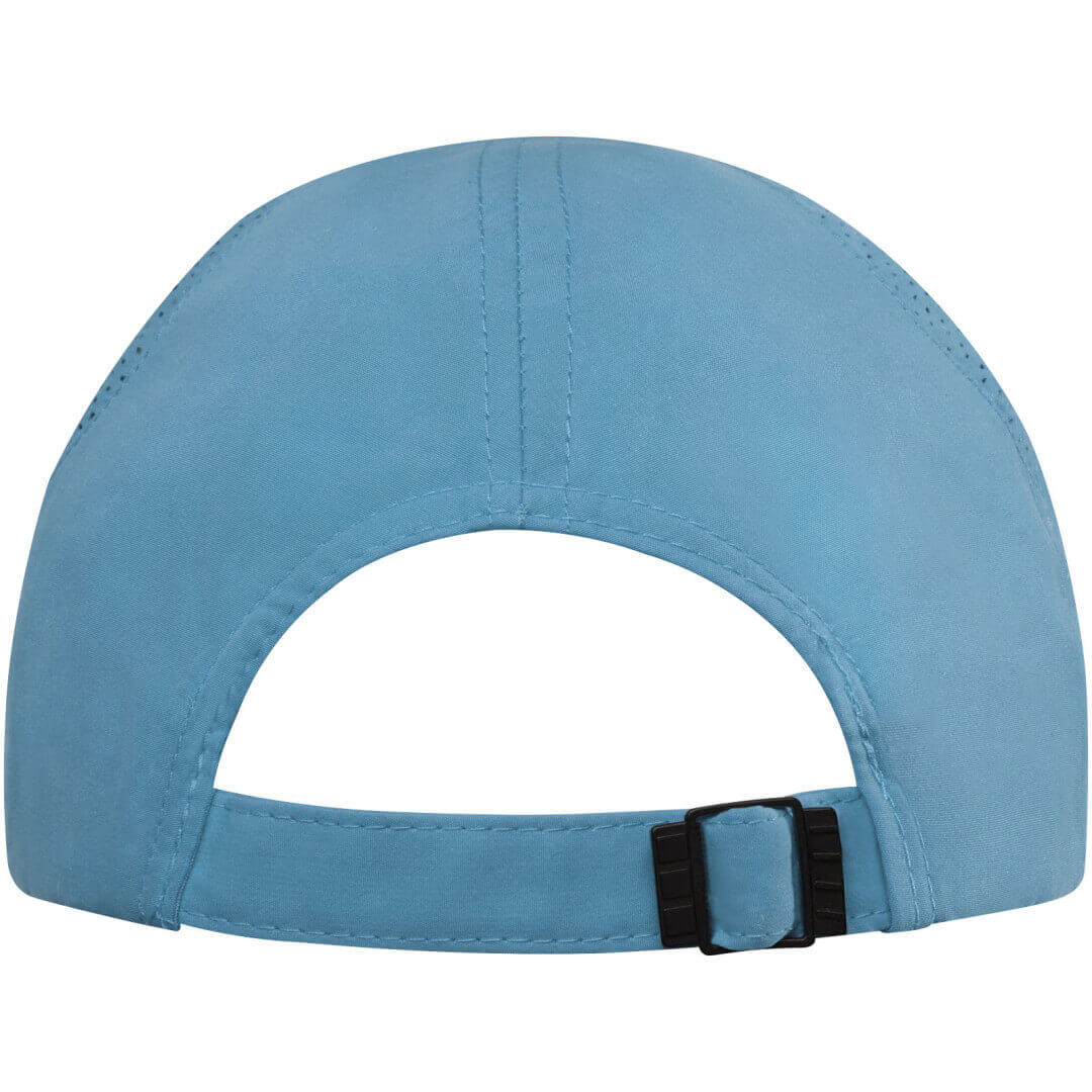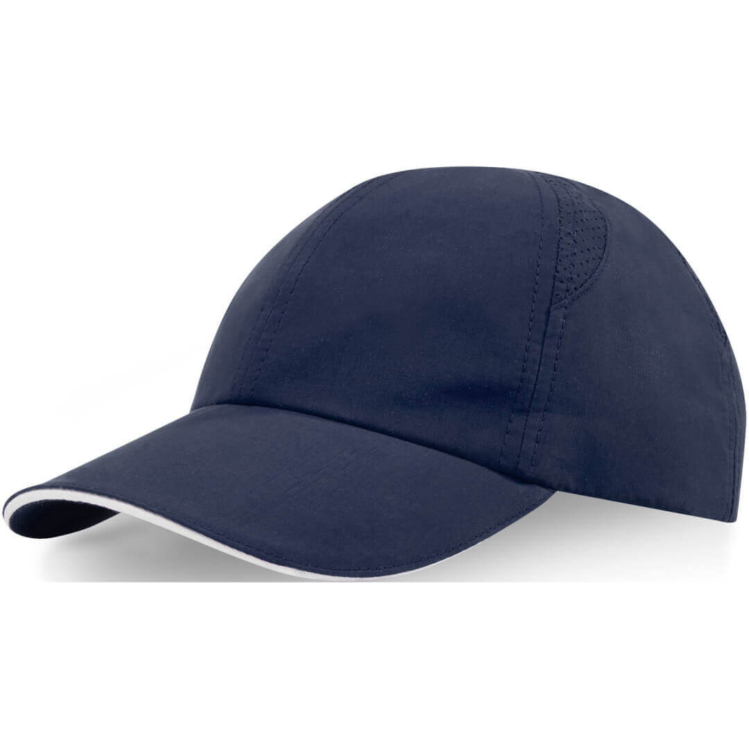 Reklamní čepice z udržitelných materiálů. Předtvarovaný kšilt se sendvičem. Laserem vyřezané větrací otvory. Kovová přezka.